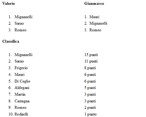 In terza posizione rimane sempre Alberto Frigerio, tallonato ora anche da Stefano Mauri oltre che da Leo di Ceglie, che sono al quarto posto a quota 6.
