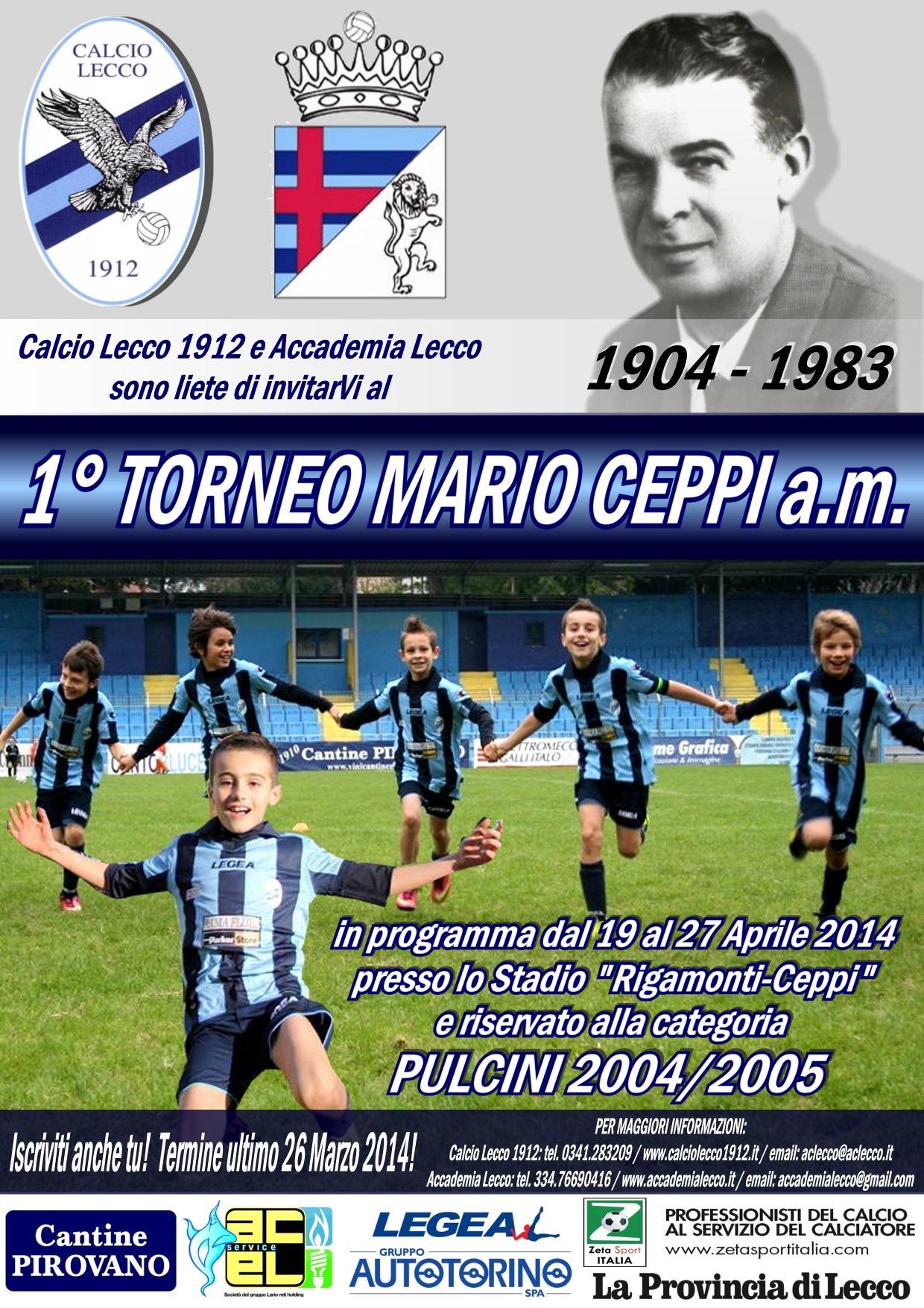 L’Accademia Lecco, in collaborazione con la Calcio Lecco 1912, indice ed organizza il 1° Torneo Mario Ceppi a.m., che si disputerà presso lo Stadio “Rigamonti-Ceppi” di Lecco nelle giornate di Sabato 19, Sabato 26 e Domenica 27 Aprile ’14.