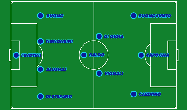 A centrocampo l’incognita è legata a Vignali, tenuto precauzionalmente a riposo giovedì e venerdì per un affaticamento muscolare. Se darà garanzie sufficienti, il motorino bluceleste scenderà regolarmente in campo, altrimenti nella sua posizione sono stati provati Raiola e Putignano, entrambi classe 1995. La mediana e la regia saranno affidate a Baldo, sempre alle prese con i problemi alle caviglie che lo tormentano da inizio anno, mentre sul centrosinistra tornerà Di Gioia dopo il turno di squalifica.