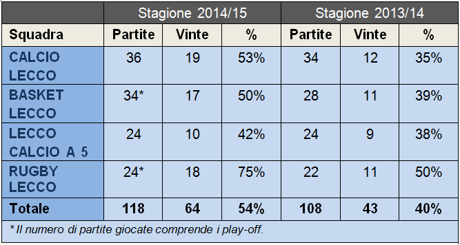 Da cosa lo possiamo evincere? Semplice. Abbiamo considerato il numero di partite stagionali disputate da Calcio Lecco, Lecco Calcio a 5, Basket Lecco e Rugby Lecco, “pesando” le vittorie in percentuale. Siamo rimasti piacevolmente sorpresi dal fatto che il totale stagionale sia un positivo 54%; in pratica, le squadre blucelesti hanno vinto più di una partita ogni due giocate. Entrando nel dettaglio statistico, solo il Lecco Calcio a 5 è rimasto sotto la soglia del 50% di successi stagionali, ma non ci è andato lontano ed è stato senza dubbio penalizzato dal pessimo inizio, con un mercato sbagliato e le correzioni apportate strada facendo.