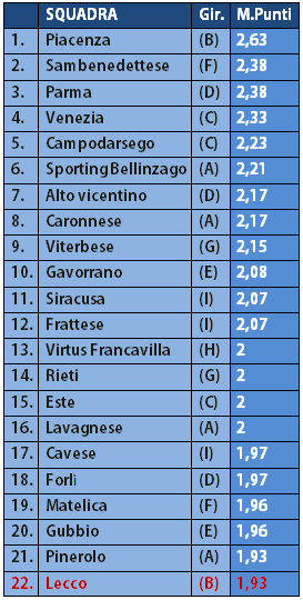 Tirando le somme, il Lecco è secondo nel girone B ma “virtualmente” sarebbe terzo in cinque altri raggruppamenti, due volte quarto e una sola secondo. Cosa significa? Di certo che gli altri gruppi sono più eterogenei ed equilibrati, ma pure che sarebbe in ogni caso difficile vincere il campionato con il ritmo stagionale dei blucelesti. Lo ripetiamo, a scanso di equivoci e permalosità: il nostro è soltanto un gioco, anche se spesso i numeri si fanno capire benissimo.