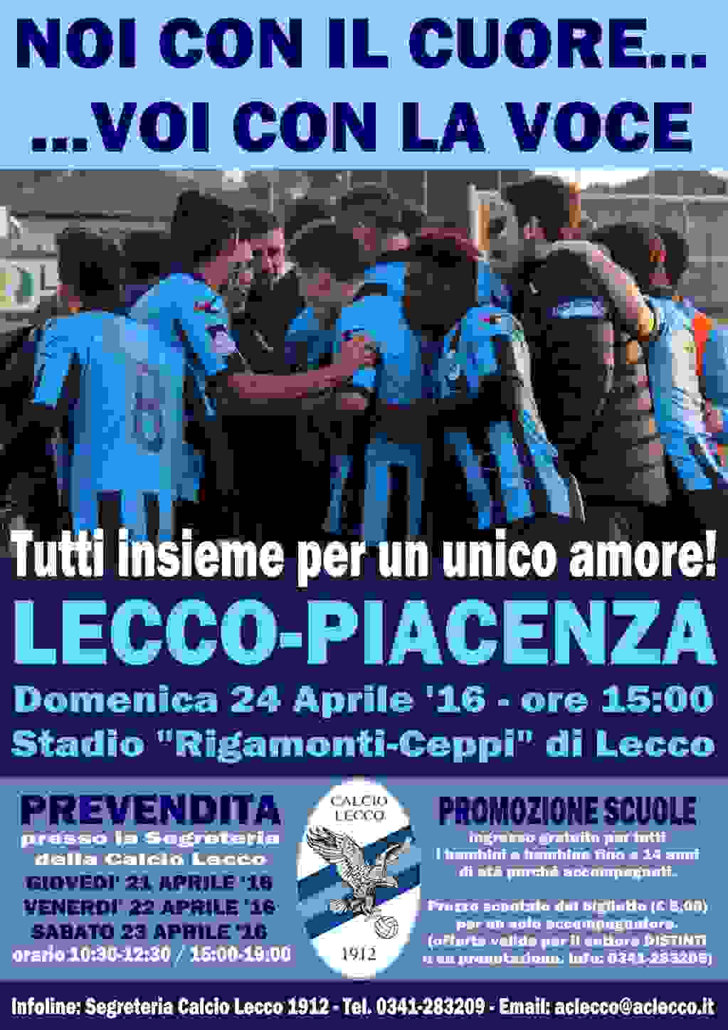 In occasione della gara di Campionato LECCO-PIACENZA, valevole per la 17^ Giornata di ritorno del Campionato Nazionale di Serie D girone B e in programma Domenica 24 Aprile ‘16 con inizio alle ore 15:00 presso lo Stadio “Rigamonti-Ceppi” di Lecco, la Calcio Lecco 1912 Srl comunica e promuove l’iniziativa denominata “NOI CON IL CUORE… VOI CON LA VOCE. Tutti insieme per un unico amore”. Alla partita sono stati invitati tutti i bambini delle scuole di Lecco che, accompagnati da un genitore, potranno assistere all’incontro dal Settore Distinti. Per un solo accompagnatore, è previsto un tagliando speciale scontato del 50%. I biglietti dovranno essere prenotati entro le ore 12:00 di Sabato 23 Aprile ’16 presso la Segreteria della Calcio Lecco 1912, a mezzo email (aclecco@aclecco.it – telefono: 0341-283209). I tagliandi saranno disponibili per il ritiro il giorno della gara a partire dalle ore 13:30 presso lo sportello del Settore Distinti. L’invito è stato esteso a tutti i settori giovanili della Provincia di Lecco, e più precisamente a tutti i giovani tesserati fino al compimento anagrafico del 14.imo anno di età. Ogni sodalizio potrà assistere alla gara dal Settore Distinti dello Stadio “Rigamonti-Ceppi” di Lecco. I club interessati possono contattare la Segreteria della Calcio Lecco entro le ore 12:00 di Sabato 23 Aprile ‘16 (email: aclecco@aclecco.it – telefono: 0341-283209).