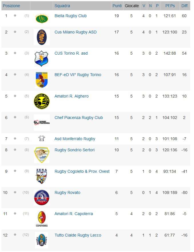 In vetta, allunga Biella che passa a Piacenza in un match equilibrato e difficile. Spicca il successo esterno del Cus Milano, a valanga sul Cogoleto, mentre il Cus Torino espugna Monferrato. Finalmente si sblocca la Sertori Sondrio, che travolge il Rovato con un pesantissimo 56-12 e si stacca dalla zona calda della classifica. Naturalmente il Lecco rimane all’ultimo posto, ma con un incontro da recuperare e la convinzione di poter fare bene da qui in avanti.