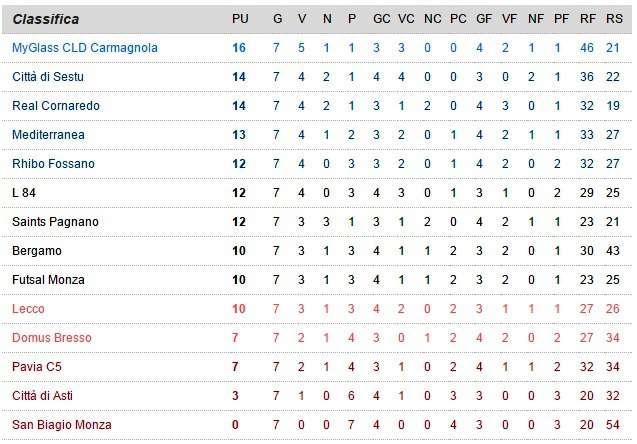 Alle sue spalle resistono il Real Cornaredo, che è passato di misura ad Asti, e il Città di Sestu, seppure sconfitto a Monza dal Futsal. Volano i meratesi del Saints Pagnano, che hanno scavalcato il Lecco (battuto nel turno precedente) dopo il brillante successo sul San Biagio, ancora fermo al palo in sette giornate.