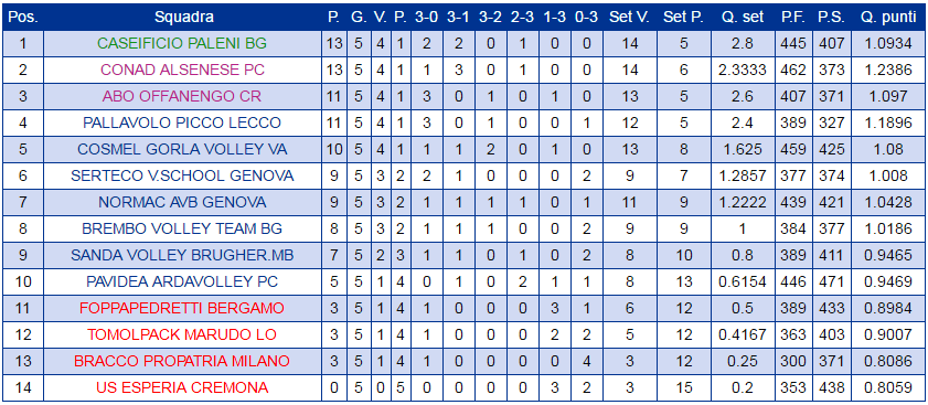 In testa, a quota 13, c’è infatti anche la Conad Alsenese, già battuta al tie-break dalla Picco nel corso di questo campionato. Da segnalare la vittoria esterna di Genova a Monza contro il Sanda, mentre la Pavidea Fiorenzuola espugna il palazzetto della Tomolpack Marudo in un’importante sfida per uscire dalle zone basse.