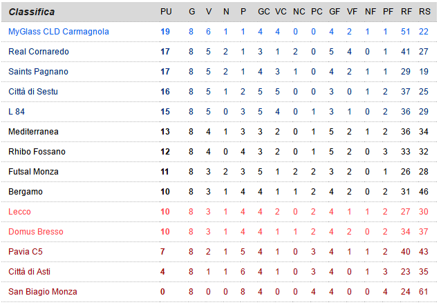 Scende a metà classifica la Mediterranea Cagliari, caduta bruscamente a Bresso. Sul fondo cambia poco: un punticino per l’Asti, con il Pavia che vende cara la pelle prima di cedere 9-8 al forte Real Cornaredo.