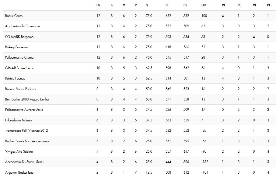 Al comando del girone si è formato un quintetto di squadre composto dalle quattro favorite della vigilia (Cento, Orzinuovi, Bergamo e Piacenza) e una outsider (Crema), mentre alle loro spalle, a soli due punti, il Basket Lecco insegue appaiato a Faenza.