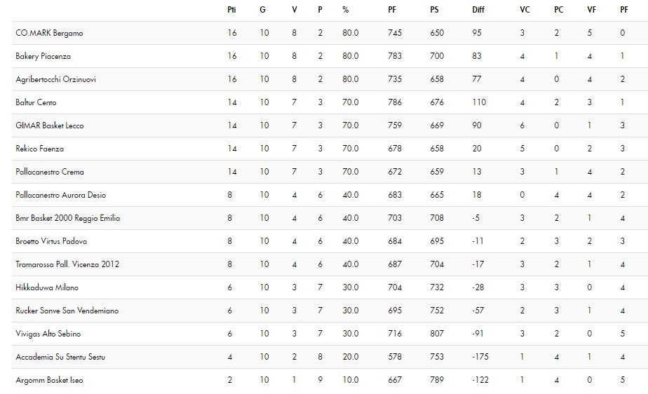 Una classifica così era difficile da ipotizzare alla vigilia del campionato. Eppure, dopo un terzo di partite disputate, il Basket Lecco è al quinto posto in classifica. O meglio, davanti ne ha soltanto tre: Bergamo e Orzinuovi contro cui ha perso, e Piacenza battuta al Bione. Aspetto ancora più importante: sono già sei le lunghezze di vantaggio sulla nona, nel gruppone delle squadre a otto punti.