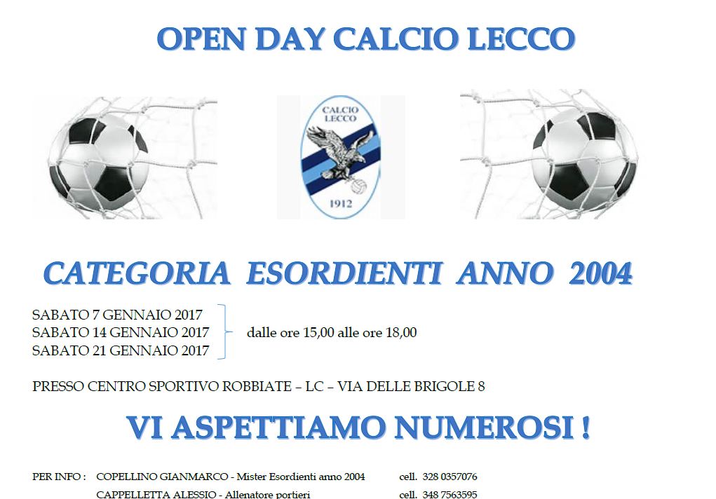 “La Calcio Lecco 1912 Srl comunica che nelle date di Sabato 7-14-21 Gennaio 2017 presso il centro sportivo di Robbiate sito in via delle Brigole a Robbiate (LC), ci saranno degli open day riservati alla categoria 2004 per incrementare il nostro organico.