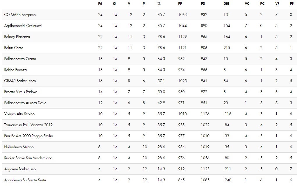 Con 8 vittorie e 6 sconfitte, il Lecco è settimo. Le lunghezze di vantaggio sulla nona, Desio, restano quattro, con scontro diretto finora sfavorevole (differenza canestri, dopo l’andata, -4). Padova, però, si è avvicinata grazie al successo su Milano ed è ottava a meno due.