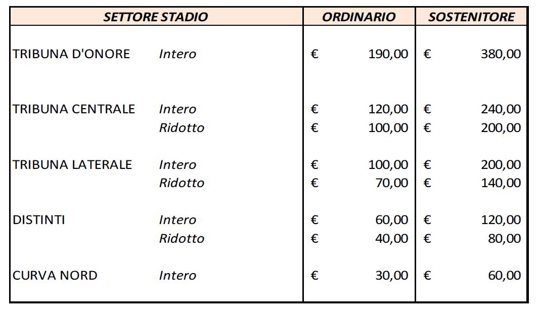 I prezzi degli abbonamenti sono parametrati ai costi applicati nella campagna abbonamenti estiva, con un adeguamento in riduzione, vista la volontà di promuovere la diffusione delle tessere, e tenendo conto che mancano 9 partite su 17 totali da giocare.