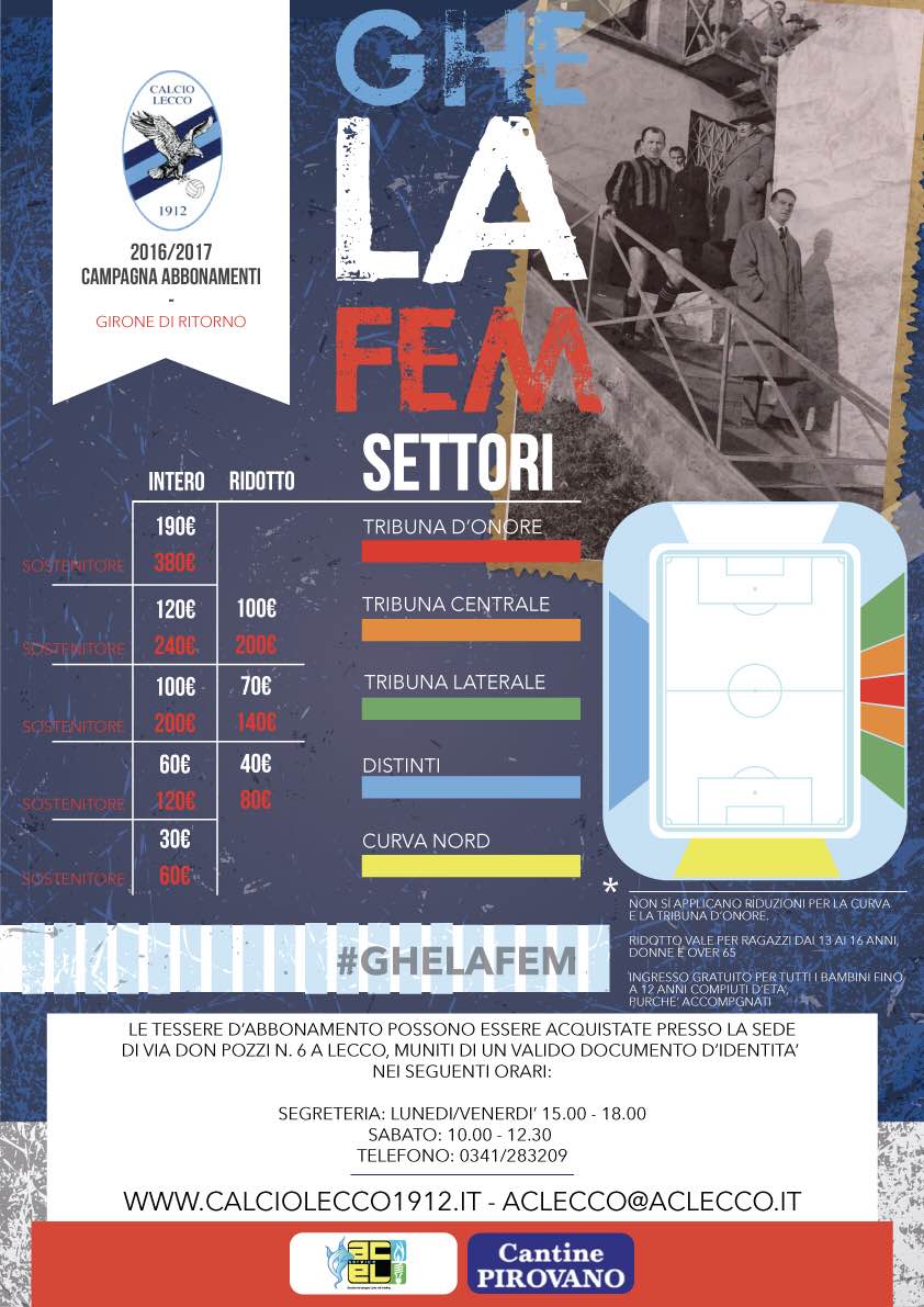 “Ghe La Fem”. È uno slogan semplice e d’impatto quello scelto dalla Calcio Lecco 1912 per lanciare la campagna d’abbonamento al girone di ritorno. Un modo di dire comunque nel nostro gergo, accompagnato dalla foto storica del Presidentissimo Mario Ceppi mentre scende le scale del “Rigamonti-Ceppi” prima di una partite che si sono disputate nei cosiddetti “anni d’oro”.