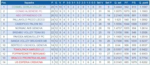 La classifica del girone è senz’altro più corta in alto, mentre lo stesso non si può dire della parte bassa, dove anche il Marudo si è staccato. Da segnalare la prima vittoria stagionale, al tie-break, di Cremona sulla Pro Patria Milano.