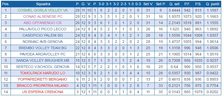 L’Offanengo è infatti caduto a sorpresa sul campo del Sanda Volley Brugherio a Monza, incamerando un solo punto (sconfitta al tie-break). La Conad Alsenese è stata trascinata al quinto, in casa, dalla Pavidea Fiorenzuola d’Arda, guadagnando due punti. Il Cosmel Gorla dovrà recuperare (da favoritissima) il proprio match contro Bergamo, ma se la Picco avesse vinto contro Genova avrebbe ottenuto due traguardi: mantenere a distanza le liguri (e Casazza) e issarsi al terzo posto in solitaria, a una sola lunghezza da Alseno.