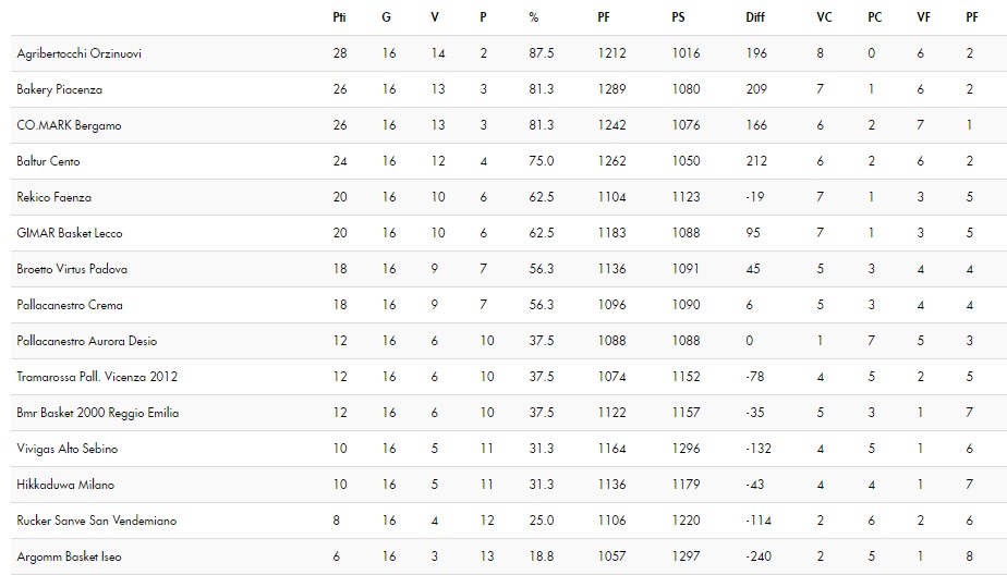 Staccata, nell’ultimo turno, Crema che ha ceduto in casa a Cento seppure dopo una grande battaglia. Nessuna sorpresa nella prima giornata di ritorno, con i successi delle prime quattro del girone. E se Cento fatica, lo stesso non si può dire per Bergamo (scarto +42), Orzinuovi (+15), Piacenza (+12), tutte passate in scioltezza.