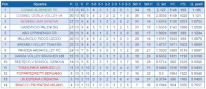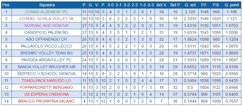 In testa è tornata Alseno che a scavalcato le varesine, mentre a quattro punti insegue Genova con Casazza e a cinque la Picco che ha agganciato Offanengo, sconfitta in casa proprio dal Caseificio Paleni nello scontro diretto. In zona ci sono anche il Brembo Volley e la sorprendente Pavidea Fiorenzuola d’Arda, autrice di una seconda parte di andata davvero convincente.
