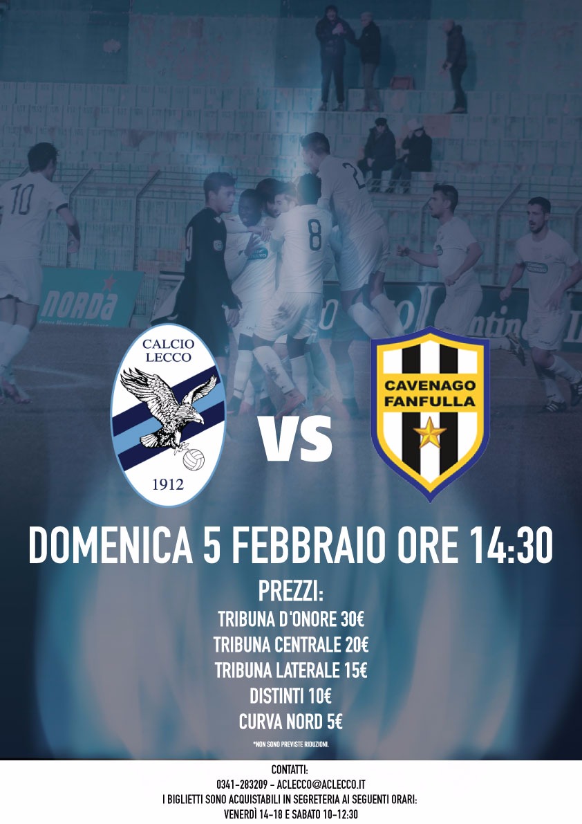 La Società Calcio Lecco 1912 S.r.l. comunica che, vista l’importanza della gara e l’alta posta in palio, per la partita LECCO-CAVENAGO FANFULLA, in programma Domenica 5 Febbraio 2017 presso lo Stadio “Rigamonti-Ceppi” di Lecco con inizio fissato alle ore 14.30, ha predisposto un servizio di prevendita, attivo presso la Segreteria di Via Don Pozzi a Lecco in base al seguente calendario: