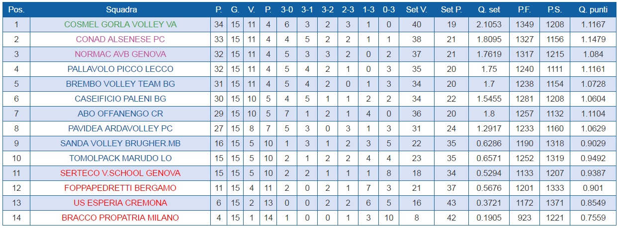 In vetta, approfittando dello scivolone della Conad Alsenese, si è riportato il Gorla nonostante la sconfitta al tie-break (proprio con le liguri), ed è curioso notare come sia stata sempre la Picco, battendo entrambe, a provocare il doppio ribaltone nel giro di due settimane.