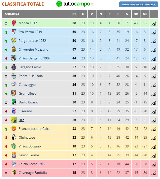 Un passaggio a vuoto che non ha fatto male, a livello di classifica. Certo, fare punti a Grumello per il Lecco avrebbe significato accorciare in maniera più o meno sostanziosa nei confronti del Dro (battuto dallo ‘Scanzo’ 1-0); perdere, invece, lascia i trentini a nove punti di distanza, un divario colmabile. Il centroclassifica è invece spaccato in due: il Caravaggio, vincendo con il Ciserano, ha virtualmente conquistato la salvezza anticipata. Più sopra di un punto c’è il Seregno, vincente a Olginate (0-1, decide Szekely) e ora a -7 dalla Virtus Bergamo (0-2 casalingo contro il Ciliverghe Mazzano). Lassù c’è sempre il Monza, che, nonostante il mezzo passo falso di Ponte San Pietro (0-0 con una valanga di occasioni sprecate), guarda la Pergolettese con un saldo vantaggio di otto punti.