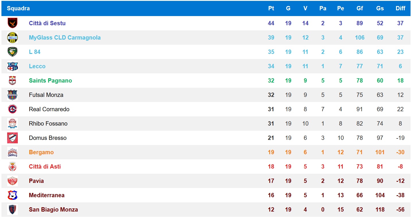 Vittoria che ha permesso il sorpasso in classifica da parte dei blucelesti, ora quarti e sempre più in zona play-off, dove entra a sorpresa – inimmaginabile due mesi fa! – il Futsal Monza. Per mister Claudio De Moraes, seppure soddisfatto della grande prova offerta in campionato, c’è la preoccupazione dei tanti impegni ravvicinati: anche settimana scorsa gran parte dei suoi ragazzi, impegnati nell’Under 21, sono scesi in campo nel turno infrasettimanale di Coppa. La speranza è che l’adrenalina prevalga sulla stanchezza.