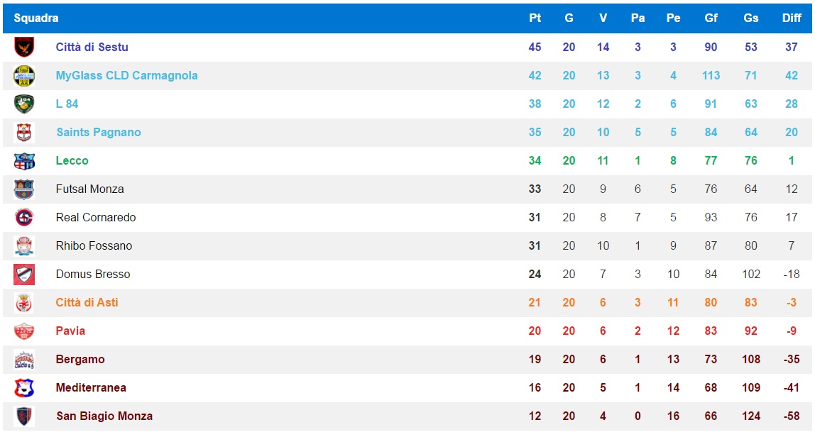 La pesante sconfitta a Volpiano contro la L84 non ha impedito al Lecco C5 di continuare a viaggiare fra le prime cinque della classifica. I Saints Pagnano, tuttavia, grazie al successo sul fanalino di coda San Biagio hanno effettuato il controsorpasso ai danni dei “cugini” blucelesti, riscattando così il derby di campionato della scorsa settimana (ampiamente riscattato anche in Coppa con il passaggio alla Finale Eight).