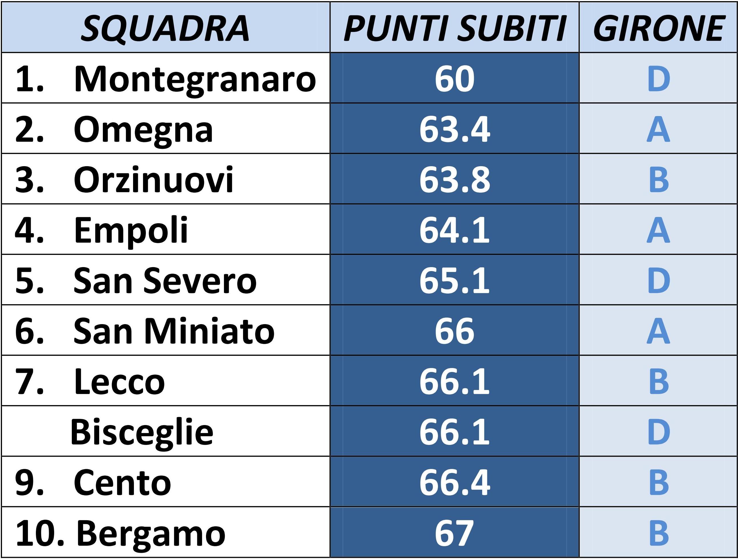 Giusto per fare un raffronto con le prime del Girone B: in questo frangente di campionato, Orzinuovi ha concesso 65 punti, Bergamo 66, Cento 68.8.