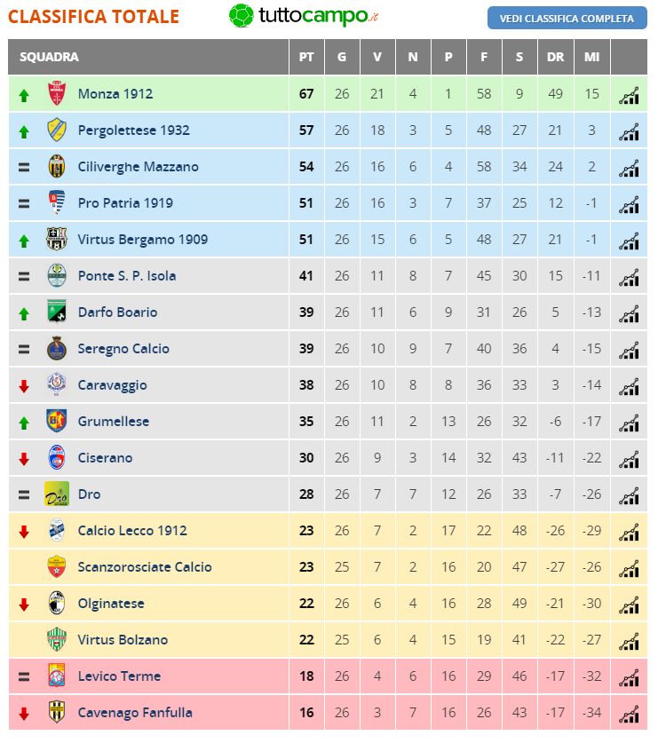 La sconfitta interna con la Virtus Bergamo non ha prodotto particolari scossoni alla classifica della Calcio Lecco 1912. Il Dro, non andando oltre il pareggio con il Ciliverghe Mazzano (1-1), si sposta infatti di un solo punto, portandosi a +5 sui blucelesti. Alle spalle, complice il rinvio della gara tra Scanzorosciate e Bolzano causa indisponibilità dell’impianto altoatesino, non succede nulla: il Levico Terme viene raggiunto dal Pontisola al 92′ (2-2), Olginatese e Cavenago Fanfulla cadono sui campi di Monza e Grumellese (3-0 e 3-2). In alto non cambia la situazione: proprio i biancorossi continuano a dominare senza conoscere pause, alle spalle tiene botta la Pergolettese (3-1 sul Ciserano), ora a +3 sul Ciliverghe.