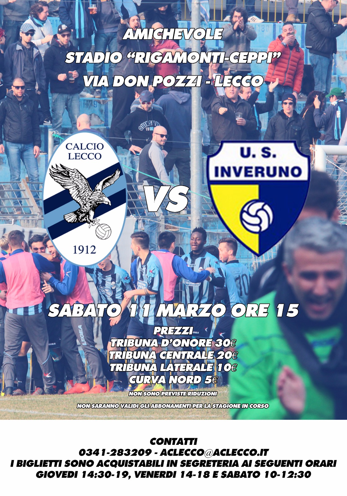 La Calcio Lecco 1912 S.r.l. comunica che Sabato 11 Marzo 2017 con inizio alle ore 15:00 presso lo Stadio “Rigamonti-Ceppi” di Lecco, la Prima Squadra disputerà una gara amichevole con l’Inveruno Calcio, formazione militante nel campionato di serie D girone A.