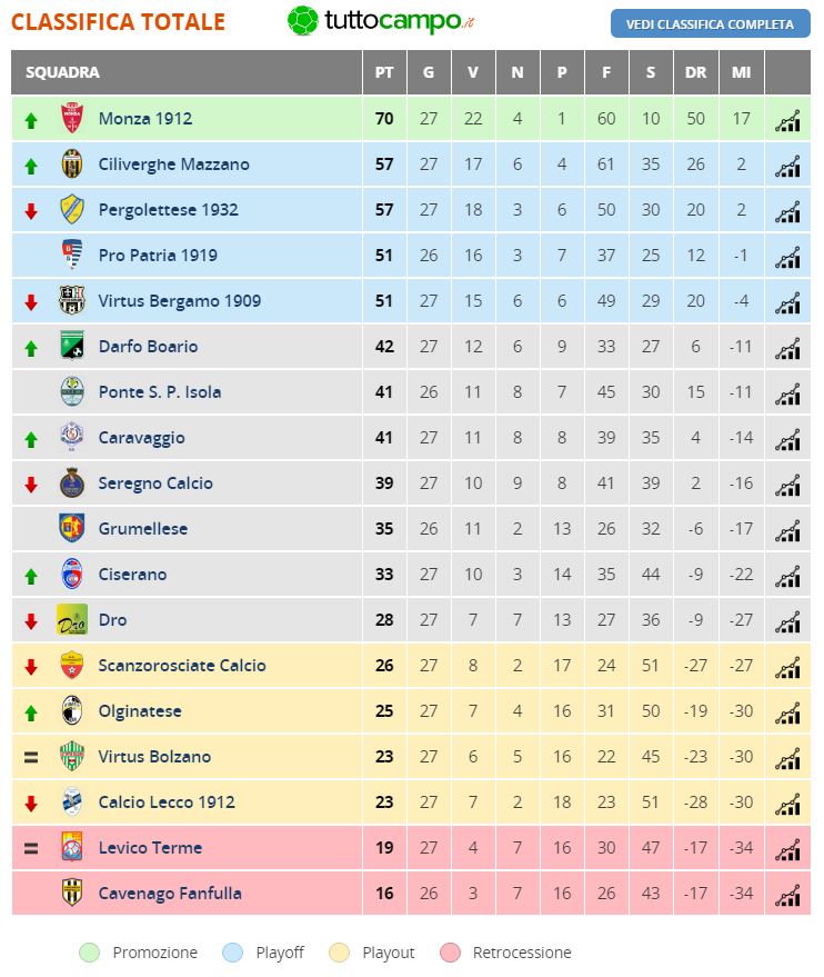 La cocente sconfitta patita dal Lecco sul campo della vicina Olginate lascia decisamente l’amaro in bocca anche per quanto riguarda la classifica. I blucelesti hanno infatti gettato via la possibilità di accorciare sul Dro, battuto nello scontro diretto di Ciserano (3-1) e sempre a +5. Il Lecco torna ad essere la terzultima squadra del girone , scavalcati dai bianconeri e raggiunti dalla Virtus Bolzano, che pareggia nel derby trentino con il Levico Terme (1-1). In alto cambia ben poco: vincendo, il Monza vola a +13 sul Ciliverghe Mazzano (3-1 al Seregno) e la Pergolettese (sconfitta 3-2 a Caravaggio), incidendo le prime lettere della parola ‘fine’ sul campionato. Entro Pasqua i bianconeri potrebbero già essere campioni. A riposo, infine, Cavenago Fanfulla, Pontisola, Pro Patria e Grumellese.