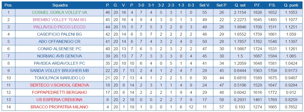 Lo stop della Normac Genova, però, ha permesso alla Picco di guadagnare un punto sulla quarta, staccata di due lunghezze, dando respiro a quella classifica che sino a poche settimane fa appariva corta come non mai. Ora, nel Girone B di B2, a sei giornate dal termine, le prime tre sembrano le più accreditate a giocarsi la promozione.