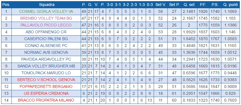 Battendo Bergamo, quinta vittoria consecutiva, le biancorosse rimangono a due punti dal Gorla, passato con qualche patema a Marudo, ma agguantano il Brembo che è stato costretto al tie-break in casa dalla Conad Alsenese. Dietro, resistono soltanto Offanengo (che ha definitivamente eliminato la Normac Genova) e Casazza, ma staccate di cinque punti dalla vetta.