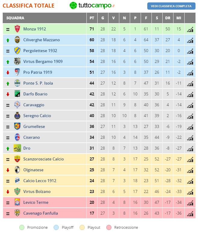 E’ una giornata caratterizzata da pochi gol e poche vittorie la ventottesima del girone B di Serie D. Il Lecco, che non va oltre lo 0-0 interno con il Ciserano, perde contatto con il Dro (+7 dopo l’1-0 alla Pro Patria) ma si riporta vicino in classifica all’Olginatese, sconfitta 2-1 a Ponte San Pietro. In coda chiudono ancora Cavenago Fanfulla e Levico Terme, che impattano (0-0) nel match di Lodi. In alto prova la rincorsa il Ciliverghe Mazzano, che vince il derby con il Darfo Boario (2-3) e si porta a -11 dalla capolista Monza (1-1 con il Caravaggio). In ripresa la Virtus Bergamo, che si conferma squadra ‘esterna’ vincendo sul campo della Virtus Bolzano (0-1).