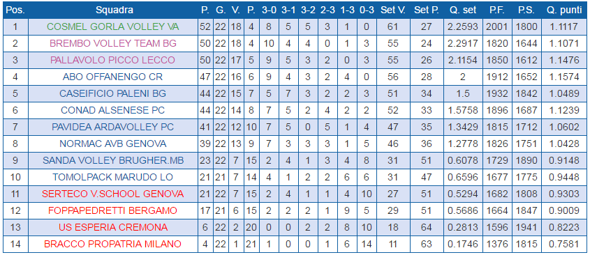 Da segnalare il crollo verticale delle due genovesi, con la Normac che dal secondo posto di un mese fa si ritrova ora ottava. La Serteco V School ripiomba invece in zona retrocessione, con Marudo pronta all’allungo quando recupererà il match con Bergamo.