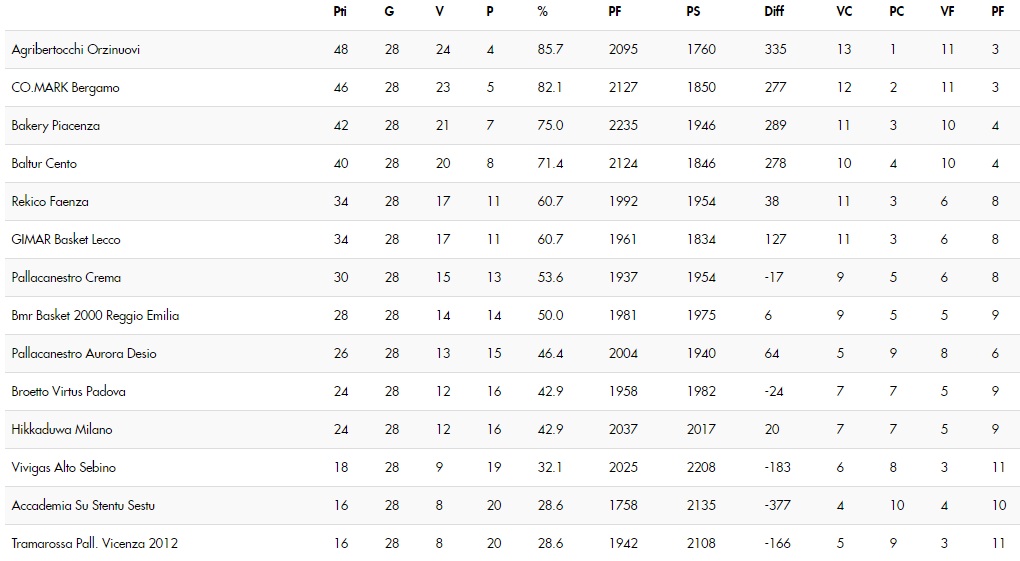 Basket Lecco e Faenza sono appaiate al quinto posto della in classifica in Serie B. Ma questa posizione, in caso di arrivo finale a pari punti, spetterebbe ai romagnoli per via del migliore scontro diretto.