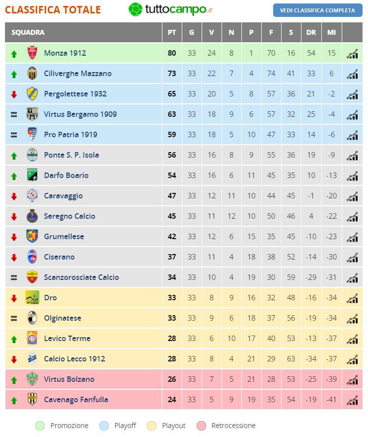 La scellerata sconfitta di Darfo Boario consegna al Lecco una classifica decisamente preoccupante, come ammesso anche da Bertolini al termine della gara bresciana. I Blucelesti nell’ultima gara di campionato contro la Pergolettese servirà infatti una vittoria senza “se” e senza “ma” per garantirsi l’accesso agli spareggi salvezza; in caso contrario, bisognerà incrociare le dita e sperare nei risultati positivi di Bolzano, soprattutto, e degli altri campi. I trentini vincono a Dro (0-3) e si lanciano nella rincorsa, il Levico Terme sbanca Caravaggio (0-3) e scavalca i nostri, lo Scanzorosciate muove passi salvezza strappando il pari in casa della Virtus Bergamo (1-1), l’Olginatese muove di poco la classifica non sfondando contro la Pro Patria (0-0), mentre retrocede definitivamente il Cavenago Fanfulla (2-3 a Ciserano). In vetta i giochi sono praticamente fatti: a giocarsi il terzo posto saranno Virtus e proprio Pergolettese, che arriverà così al “Rigamonti-Ceppi” per fare risultato pieno. Onestamente non la miglior prospettiva per il Lecco.
