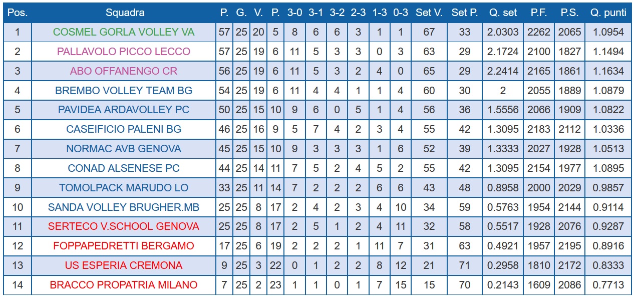 Le bergamasche, cadendo a sorpresa sul campo del Marudo, hanno lanciato Gorla e Picco a braccetto verso l’ultimo appuntamento che, ironia della sorte, sarà proprio lo scontro diretto tra le due capoliste. Chi vincerà sarà promosso in Serie B1. La situazione è intricata per i play-off: Offanengo ha superato proprio il Brembo e tallona le prime due, anche se è quasi impossibile la promozione diretta. Le cremonesi, grazie a un bel recupero nel girone di ritorno, hanno messo però un’ipoteca sui play-off.