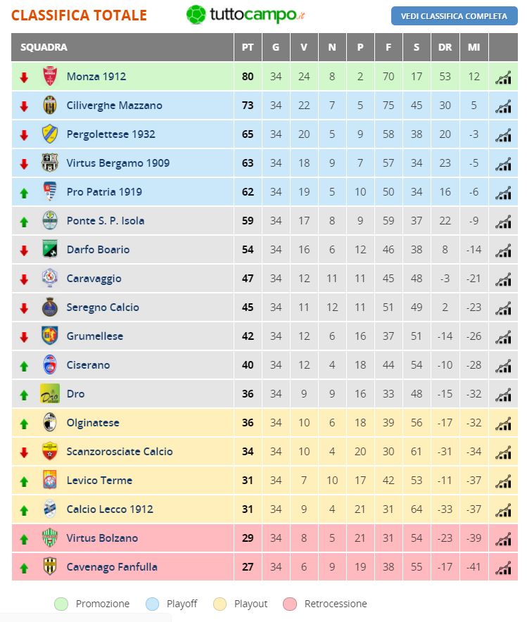 Ultima di campionato, il mondo cambia. La vittoria di sette delle ultime otto squadre della classifica, Lecco compreso, produce un ribaltone degno di nota: l’Olginatese, imponendosi per 0-2 sul campo dello Scanzorosciate, permette al Dro (0-1 a Monza) di salvarsi direttamente all’ultima curva. Ai bergamaschi toccherà ora disputare il playout contro il Levico Terme, uscito vincitore dall’incrocio con la Virtus Bergamo (2-0); saluta con onore il campionato anche la Virtus Bolzano (3-1 al dimesso Seregno), mentre in vetta le prime quattro cadono contemporaneamente. Il Monza, dominatore del torneo, chiude con 80 punti, i medesimi collezionati dal Lecco secondo nella stagione scorsa.