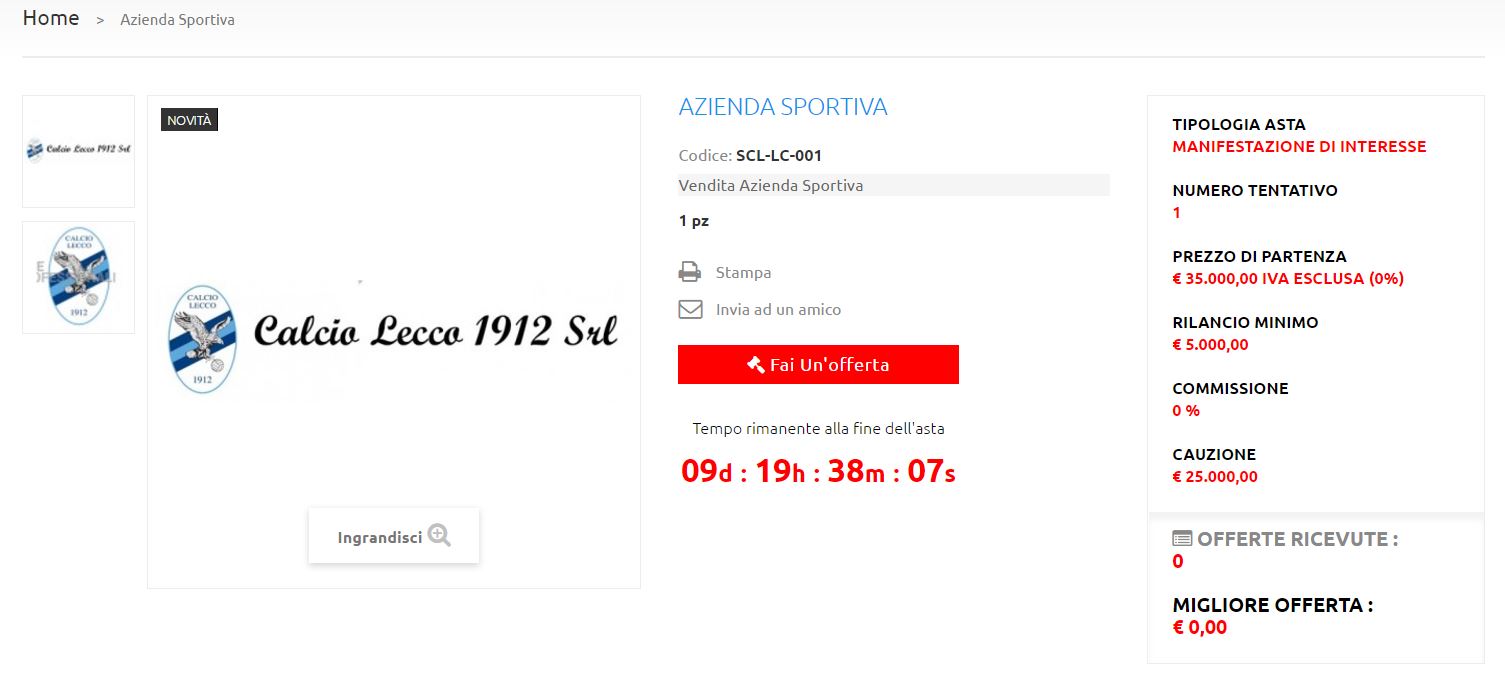 “Azienda sportiva caratterizzata da beni mobili materiali, dal marchio “Calcio Lecco 1912” e da avviamento.