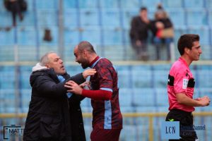 Da una di queste nasce il finimondo: quando Bertani mette in fondo alla rete la palla giocata in mezzo all’area da Luoni tutti, ospiti compresi, rimangono semplicemente abbagliati dalla bellezza della giocata, che l’attaccante bluceleste festeggia abbandonandosi alla giusta gioia. Troppa, per il signor Monaco, che giudica la rampegata sulla remada abbastanza grave da essere punita con il secondo giallo. Il direttore si limita ad applicare senza la minima interpretazione il cavillo normativo: “qui comando io”, questo è il messaggio che fa passare il sig. Monaco di Termoli. Si scatena il finimondo, Di Nunno entra in campo per chiedere spiegazioni, il gioco non riprende per un bel po’.