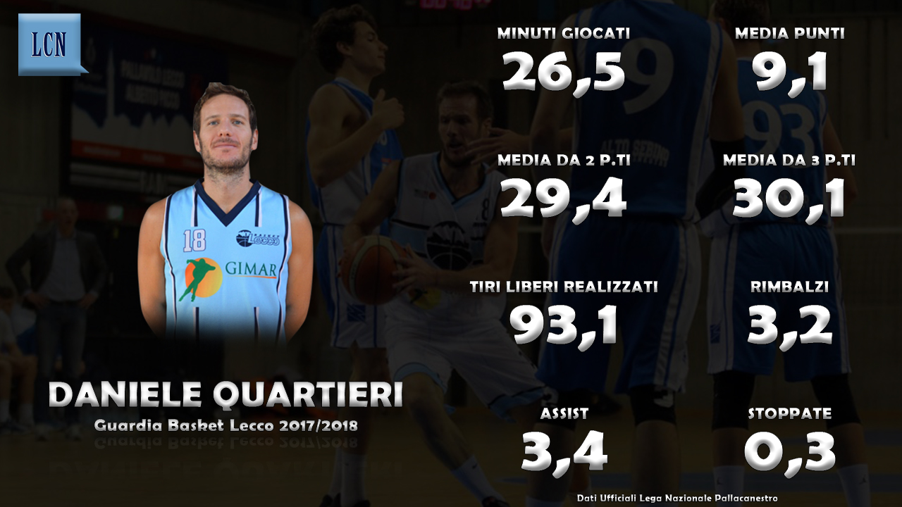 Daniele Quartieri, 30 anni, ha vissuto la sua seconda stagione in maglia Basket Lecco tra alti e bassi (forzati). Occorre infatti posizionare una linea di demarcazione ben definita tra la sua prima porzione di campionato in Serie B, 13 partite con 11,7 punti di media (sette gare in doppia cifra, 34 punti contro Lugo), e la seconda.