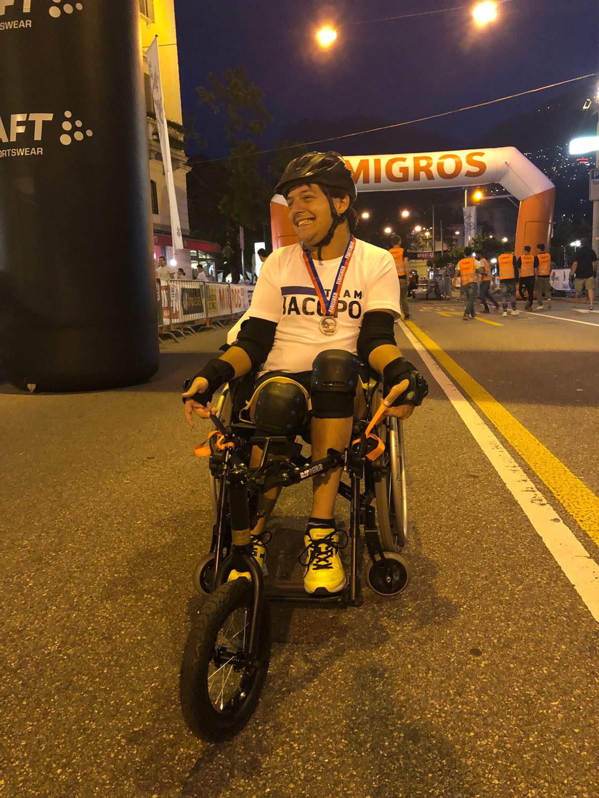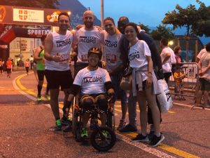 Da cosa nasce cosa, quindi, dopo la Stralugano del 2017, è arrivata la gara di Chia nello scorso aprile e adesso la seconda volta in Svizzera, con un’organizzazione sempre più performante: «La sedia a rotelle con tre ruote e la possibilità di pedalare parzialmente costituiscono un aspetto della mia partecipazione. L’altro è la creazione di un team di amici che corrono con me, dividendo tra loro i chilometri della gara», spiega Jacopo, che è diventato così un po’ atleta, un po’ inventore e un po’ team manager. Anche in questo caso Jacopo ci ha messo un quid particolare: «Dal momento che sono appassionato di viaggi, ho tanti amici in giro per il mondo, così alcuni di essi sono arrivati dall’estero».