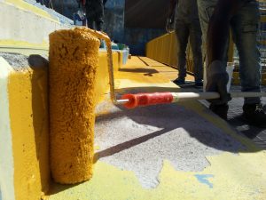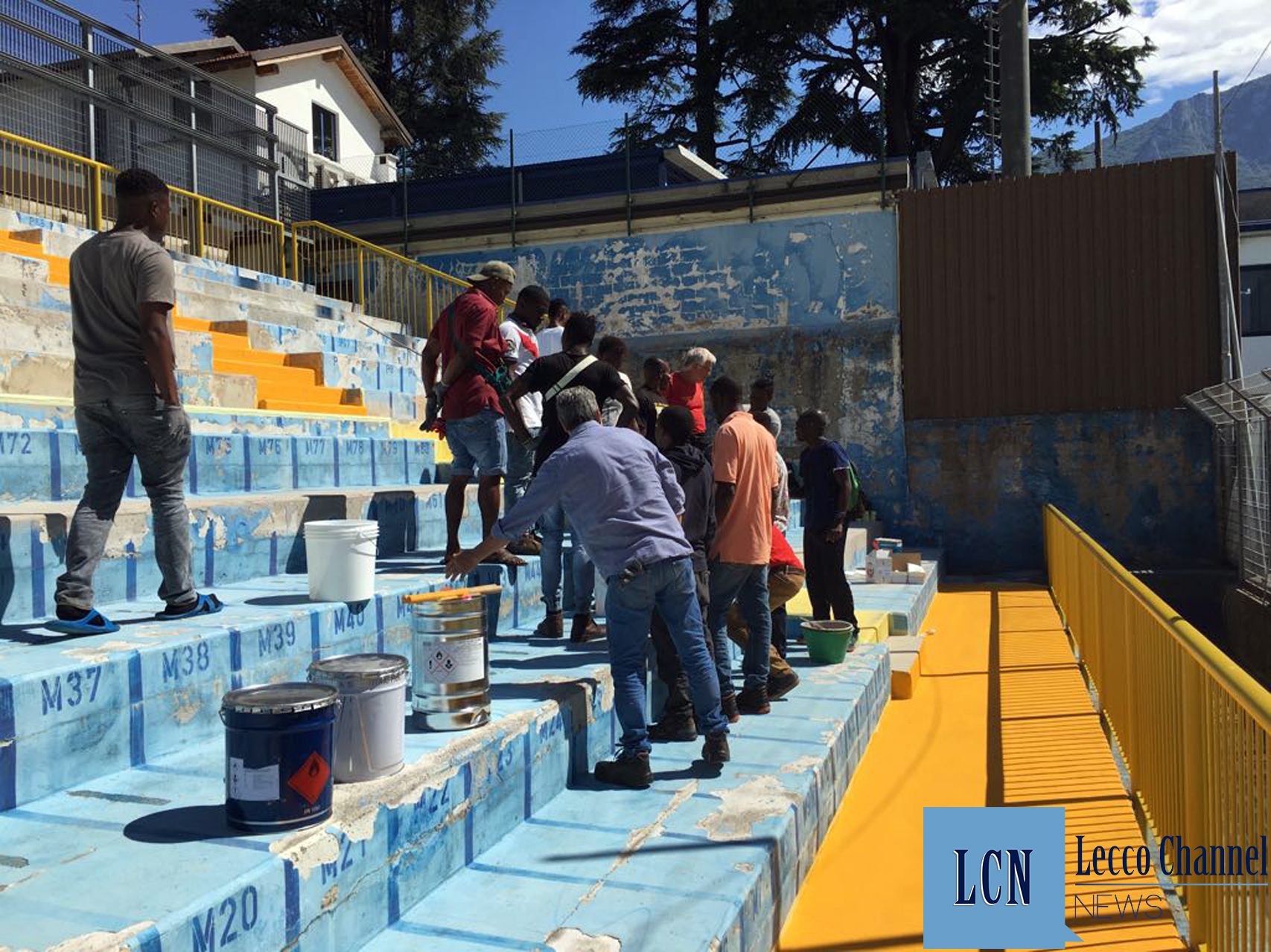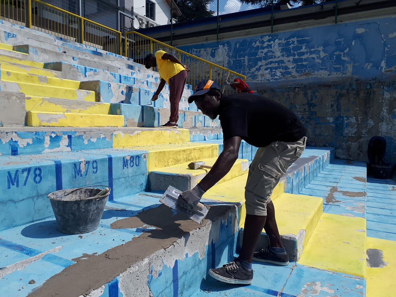 I partecipanti al progetto “Volontariato migranti” hanno iniziato a tinteggiare le vie di fuga, che, come il resto delle gradinate, nelle scorse settimane sono state sabbiate, scrostate e rimesse “in bolla”. Come da programma, nel corso della settimana odierna sono entrati in azione ai rulli, che daranno alla parte gialla dello stadio (obbligatoria quella colorazione) un tono meno acceso.