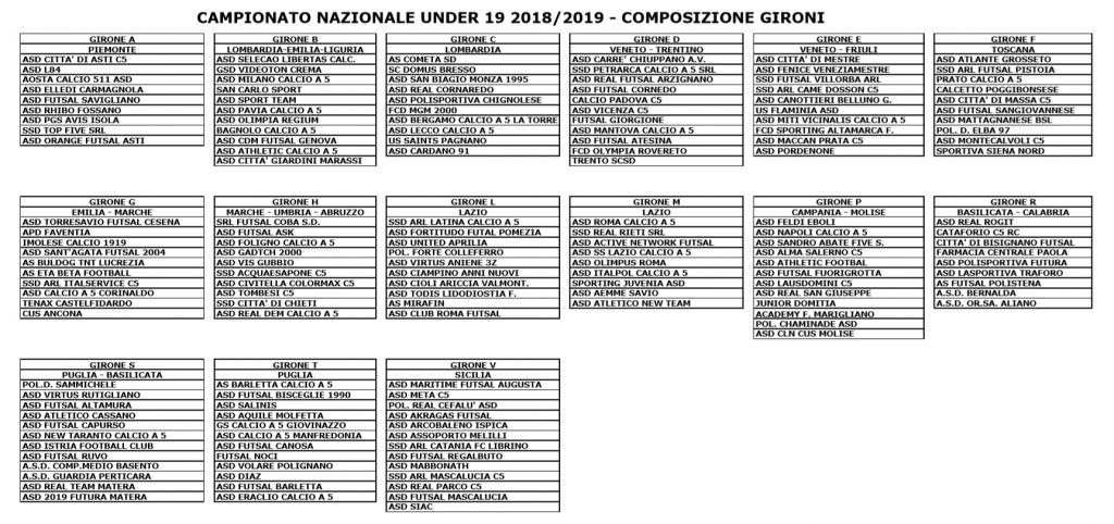 Sono stati ufficializzati dalla Divisione Calcio a cinque i sedici gironi del campionato di Under 19 che interessa le nostre due società