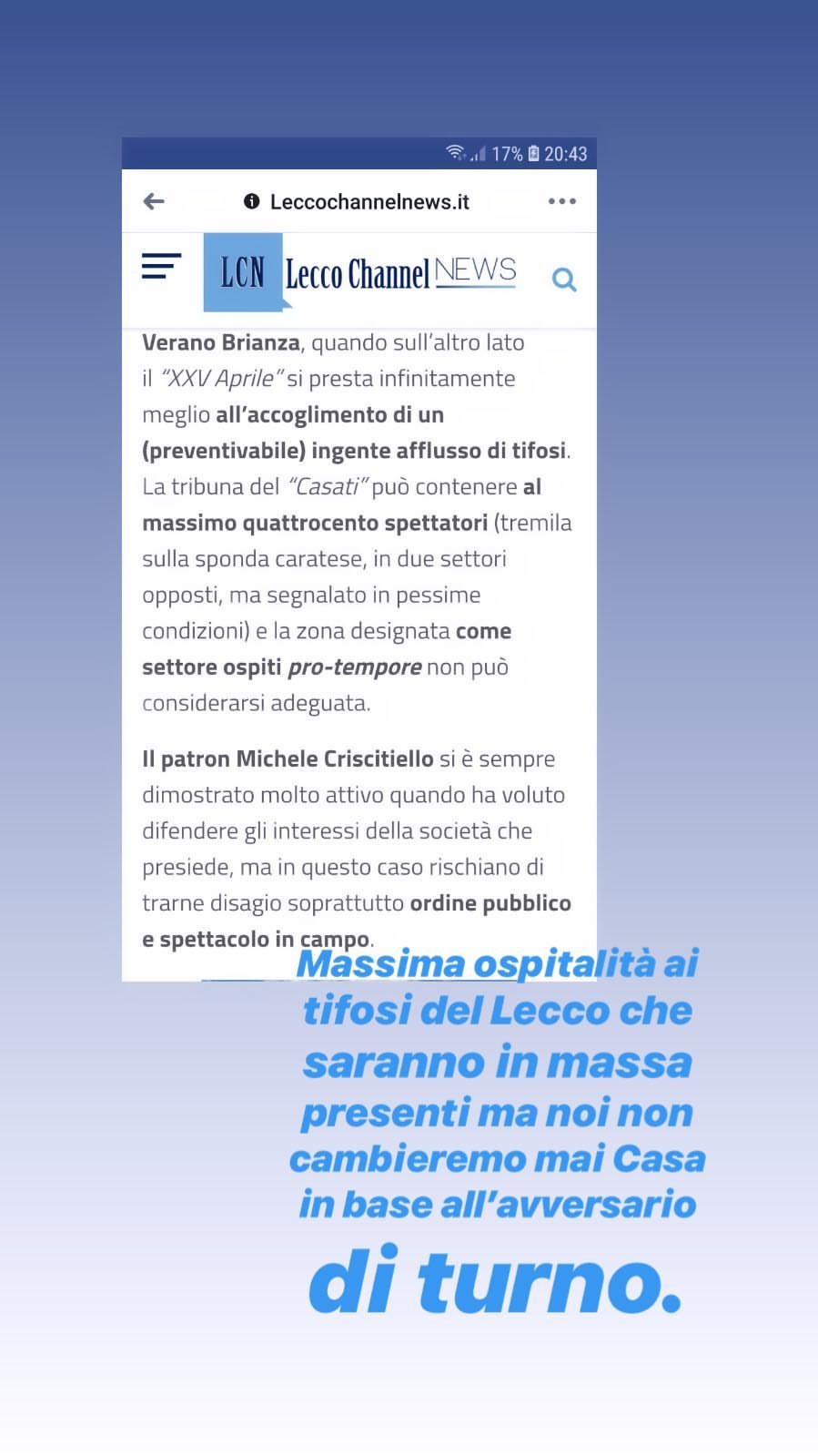 Si torna a parlare di Folgore Caratese-Lecco e della questione relativa al centro sportivo “Claudio Casati” di Verano Brianza. E si torna a parlarne dopo il post diffuso su Instagram dal presidente della Folgore Michele Criscitello, che ha commentato con le parole sopracitate l’articolo da noi diffuso nella giornata di lunedì.