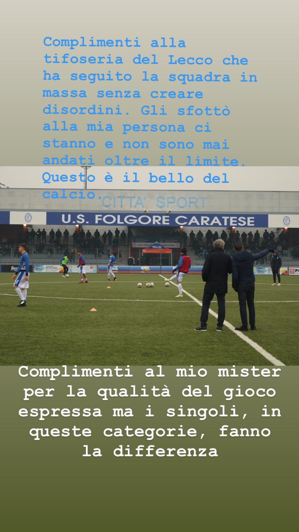 E l’ha fatto, come gli è capitato anche nel corso della settimana antecedente, affidandosi al suo profilo Instagram: attraverso una Stories, corredata da una foto scattata insieme a mister Marco Gaburro, ha porto i suoi complimenti ai tifosi blucelesti: «Hanno seguito la squadra in massa senza creare disordini. Gli sfottò alla mia persona ci stanno e non sono mai andati oltre il limite. Questo è il bello del calcio». Nessuna polemica, quindi, dopo il battibecco e i cori ricevuti dai supporter una volta cacciato dal campo.