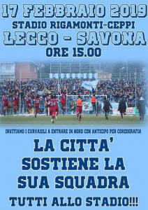 La capolista indiscussa del Girone A di Serie D sfiderà la, in attesa dei recuperi di mercoledì 13, la terza forza del campionato. L’appuntamento è fissato per domenica 17 febbraio alle ore 15.00, ma i “curvaioli sono invitati a entrare in Nord con anticipo per la coreografia”. I tifosi si stanno già organizzando per mettere in scena un altro spettacolo, dopo quelli (splendidamenti riusciti) contro Sanremese e Casale.