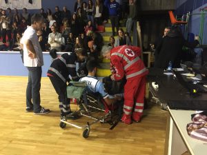 7 – Spera scaccia i “fantasmi”. Non è solo un ex di quelli “pesanti”. Gaetano Spera lo scorso anno, nel derby di ritorno, fu vittima di un grave infortunio (nella foto) che pose fine alla su stagione e forse alle speranze del Basket Lecco di fare strada nei play-off. Il lungo ora veste la canotta biancoblu. Partita carica di significati per lui, che all’andata non era ancora presente.