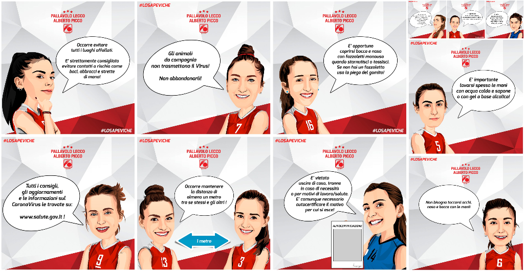 Undici card per riepilogare i passi fondamentali del Decreto emesso lo scorso 11 marzo dal Governo Conte. E’ l’iniziativa presa dall’area comunicazione della Pallavolo Lecco Alberto Picco, che fa seguito al video diffuso lo scorso 10 marzo e in cui erano ritratte le dodici giocatrici della Prima Squadra mentre recitavano l’ormai tradizionale “Io sto a casa”. In questo caso le caricature delle atlete biancorosse sono state utilizzate per ribadire i concetti che, almeno ai più, dovrebbero essere già ben noti.