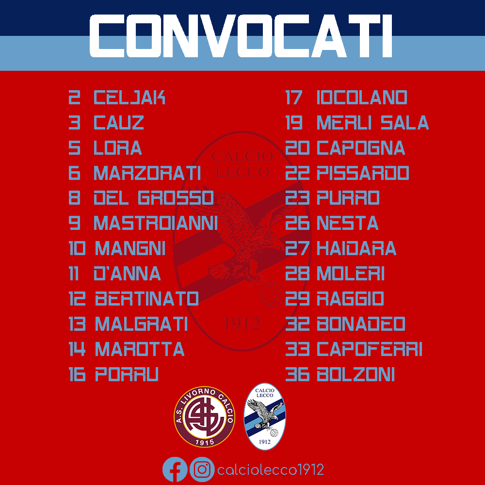 Dal canto suo, mister Gaetano D’Agostino avrà la possibilità di mandare in campo anche gli ultimi arrivati Fabio Lora e Marco Pissardo, arrivati nella settimana che ha fatto seguito alla vittoria sulla Giana Erminio. Due avvicinamenti agli antipodi, ma che sappiamo non essere portatori di certezze sul campo da gioco: «Il Livorno non ha mai giocato un’amichevole e in queste prime uscite ha messo nelle gambe un po’ di minuti. Noi ci dobbiamo concentrare su una squadra forte che ha nomi importanti, ma non dobbiamo avere paura e imporre il nostro gioco. Scendiamo in campo sempre per vincere, su qualsiasi campo perché siamo il Lecco. Lora e Pissardo che sono due ottimi innesti, sono contento di essere messo in difficoltà. Galli, invece, ha ricominciato a correre, ma lo preserviamo per precauzione e proprio Lora, che avevamo già valutato in estate, può tornare utile per gli strappi che offre e la voglia che ha di giocare a ritmi alti. Potrà fare la differenza anche a partita in corso».