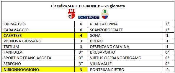Seconda giornata del campionato di Serie D 2020/2021, girone B, senza gara rinviata alcuna: a differenza del turno inaugurale, che ha visto svariate defezioni nel programma per cause di forza maggiore, tutte le formazioni sono scese regolarmente in campo. Una domenica da incorniciare per Casatese e NibionnOggiono, che hanno festeggiato la prima vittoria del nuovo campionato, portandosi rispettivamente a quota quattro e tre punti in graduatoria.